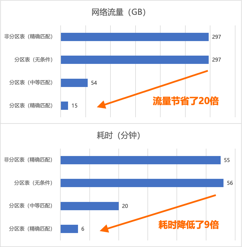 同时在相同数据规模下,我们压测了非分区表和分区表的流式读取性能,分别测试了三种分区条件下的流式读取性能:无条件、中等匹配(命中5个分区)、精确匹配(命中1个分区)。从结果可见,在分区条件仅匹配 1/20 的分区时,网络流量减少了约 20 倍 ,处理耗时降低了近 9 倍 ,展现出分区裁剪在流式读取中的巨大性能优势。