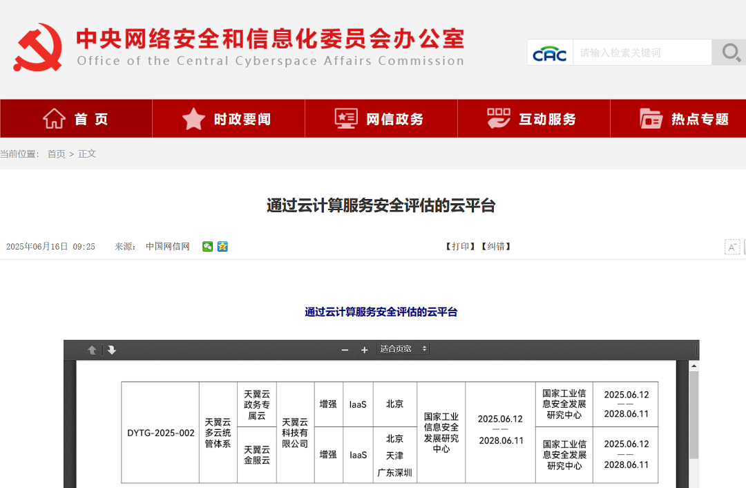 2025年6月16日,天翼云多云统管体系顺利通过中央网信办云计算服务安全评估,天翼云政务专属云、天翼云金服云作为体系验证节点,也顺利通过此次评估(增强级)。这标志着天翼云在云计算安全领域取得重大突破,在云安全保障方面已达到业内领先水平,能够满足行业应用上云的高安全、高可靠要求。
