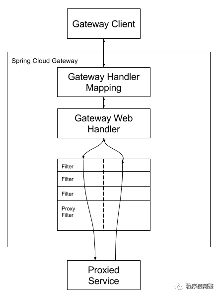 客户端向Spring Cloud Gateway发出请求。如果Gateway处理程序映射确定一个请求与路由相匹配,它将被发送到Gateway Web处理程序。这个处理程序通过一个特定于该请求的过滤器链来运行该请求。