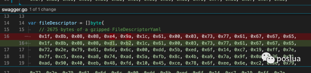 但是在多人协作的时候,总有个奇怪的问题:swagger 并没有更新,但是这个 fileDescriptor 有时却生成的不一样。并且每次都是文件头的第5-6个字节的位置: