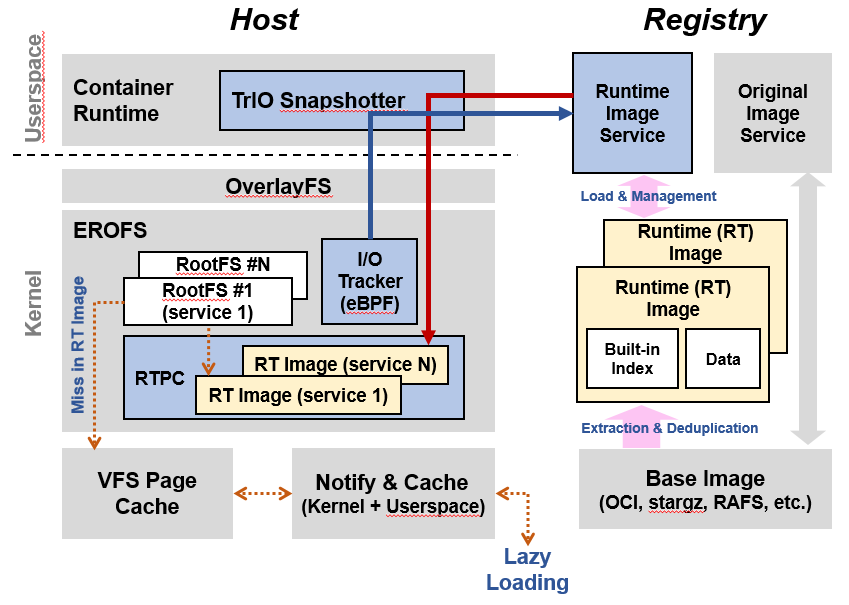 TrIO 驱动程序:在容器运行时内工作,起到控制平面作用。 I/O 跟踪器:在操作系统内核中工作,并在容器运行期间收集 I/O 行为。 运行时页面缓存:在文件系统中实现,它基于容器镜像和 I/O 特征高效构建容器的根文件系统。 运行时镜像管理服务:部署在镜像仓库后端用于服务于运行时镜像管理。