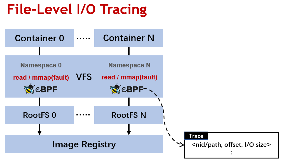 TrIO 的核心思想是聚合 I/O 操作。容器启动过程中会使用分散在不同文件中的不同部分,从而频繁触发网络 I/O 来读取不同文件内容,造成效率低下。TrIO 首先利用 eBPF 跟踪收集容器启动时读取镜像文件的所有 I/O 请求,然后将这些 I/O 请求编排为容器镜像中,并将它们推送到镜像仓库后端。在容器启动时,只需要一次大 I/O 将编排过的镜像一次性拉到本地容器节点,即可完成镜像读取,大幅降低了 I/O 次数,提升了 I/O 和网络效率。
