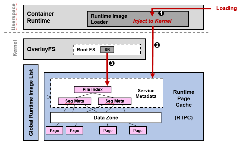 经过 I/O 聚合后的镜像,在本地容器节点无法直接生成容器的根文件系统,而需要将聚合后的内容还原回每个文件对应的部分。TrIO 中的运行时页面缓存来解决这个问题。运行时页面缓存构建在 OverlayFS 层,将聚合镜像中的内容缓存在相应文件的区域并建立索引。进一步运行时页面缓存提供增量加载和去重的功能,不同聚合镜像中相同的页面会映射到同一个运行时页面缓存,减少了系统的内存占用。
