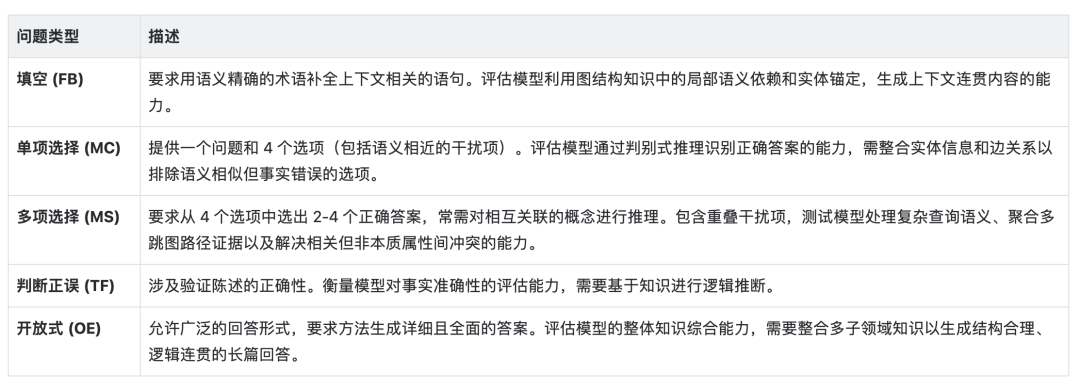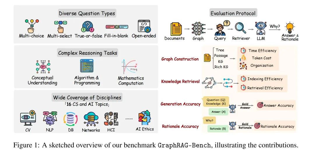 从涵盖计算机科学 16 个不同子领域的 100 多份出版物出发,系统性地筛选出最具代表性的 20 本教材。我们定义了五种问题类型,每种针对 GraphRAG 推理能力的不同方面。最终选取出 1018 道高质量挑战性问题,覆盖了广泛的主题。