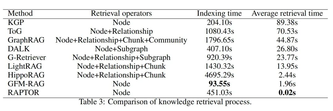 平均检索时间 (Average retrieval time): 每个查询进行知识检索的平均耗时。此外,我们总结每种方法使用的检索操作对象(Retrieval operators)以评估其检索机制的复杂度。