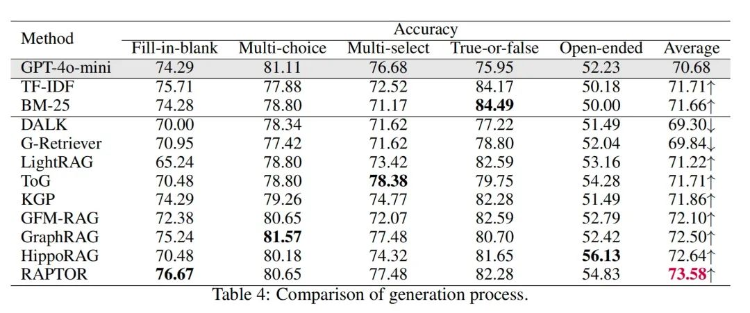 小幅提升: LightRAG、ToG 和 KGP 实现了小幅性能提升,表明其检索到的内容对生成任务提供了有限的帮助。