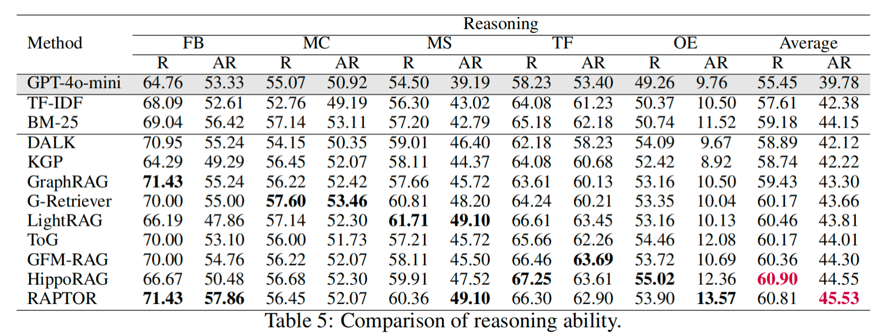 鉴于 GPT-4o-mini 本身已具备较强的问答能力,并非所有 GraphRAG 方法都能有效提升其性能。