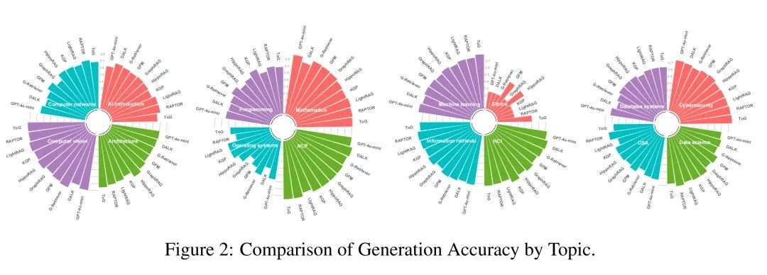 稳健性: 优秀的 GraphRAG 方法在大多数主题上显著提升了 LLM 的生成准确率,展现出稳健的性能,验证了其跨领域有效性。