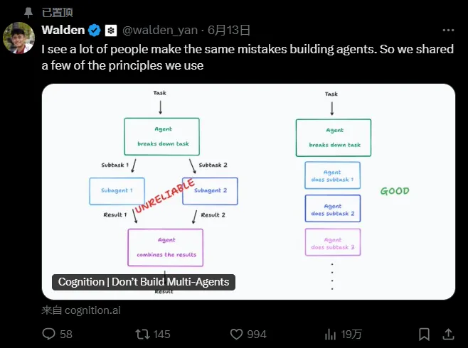 Cognition的态度很明确:现在的多智能体系统就是个"看起来很美"的陷阱。他们直接开炮:"别搞多智能体了,这条路走不通。"