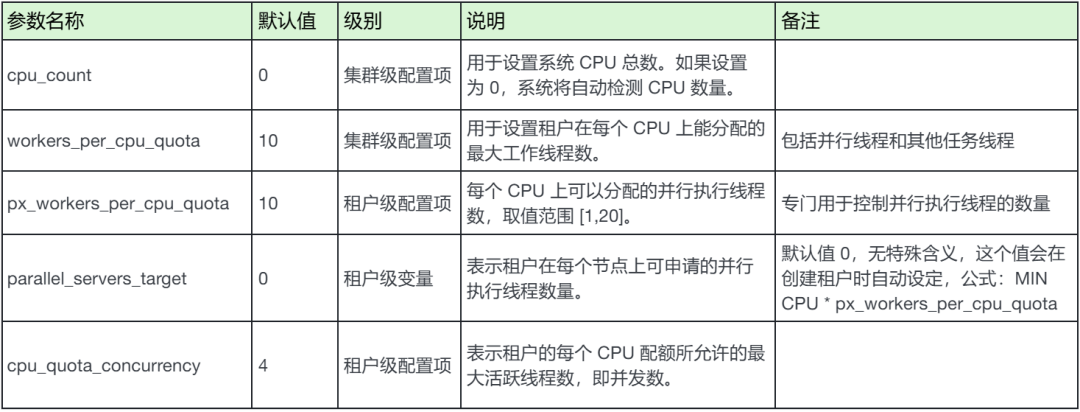 《cpu_quota_concurrency》:https://www.oceanbase.com/docs/common-oceanbase-database-cn-1000000002015547 《并行查询的参数调优》:https://www.oceanbase.com/docs/common-oceanbase-database-cn-1000000002013758 《设置并行执行参数》:https://www.oceanbase.com/docs/common-oceanbase-database-cn-1000000002016195 《并发控制与排队》:https://www.oceanbase.com/docs/common-oceanbase-database-cn-1000000002016196 《PX 并行度与速度快慢的关系》:https://www.oceanbase.com/knowledge-base/oceanbase-database-1000000000466049?back=kb 《工作线程》:https://www.oceanbase.com/docs/common-oceanbase-database-cn-1000000002014039 《多租户线程常见问题》:https://www.oceanbase.com/docs/common-oceanbase-database-cn-1000000000218492 《后台线程》:https://www.oceanbase.com/docs/common-oceanbase-database-cn-1000000002014037