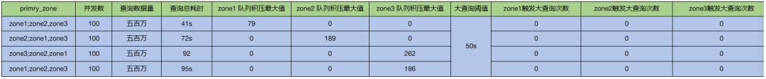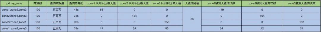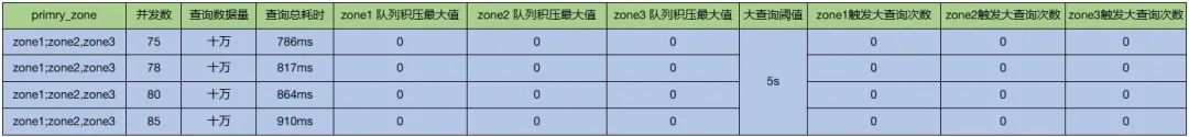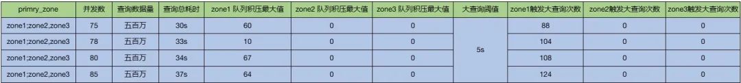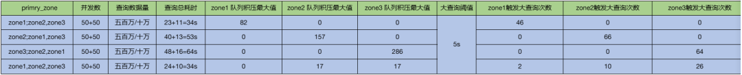 等于 80,但在实际应用场景中,达到 80 并发并不一定会产生队列等待;未达到 80 并发也可能产生队列等待,与查询种类(大查询/小查询)密切相关。场景三&场景四:大查询阈值并非越大越好,在 primary_zone 为 zone 相同优先级时,大查询阈值过大可能导致严重的队列积压从而导致 SQL 执行耗时大幅度上升。