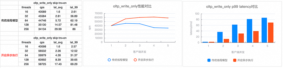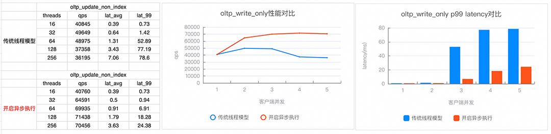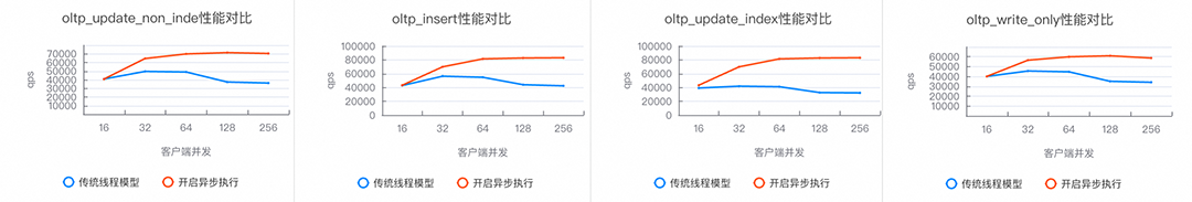 图6:sysbench oltp_write_only性能对比基于不断创新的驱动力以及对高并发数据库技术难题的深入理解,PolarDB在MySQL架构中引入了革新的全异步执行架构,旨在解决传统方案无法处理的数据库内核高并发瓶颈。同时全异步执行架构还在快速迭代中,随着进一步的性能测试和优化,PolarDB异步执行方案会在更多应用场景中持续展现其技术优势。点击阅读原文了解 PolarDB全异步执行架构 详情