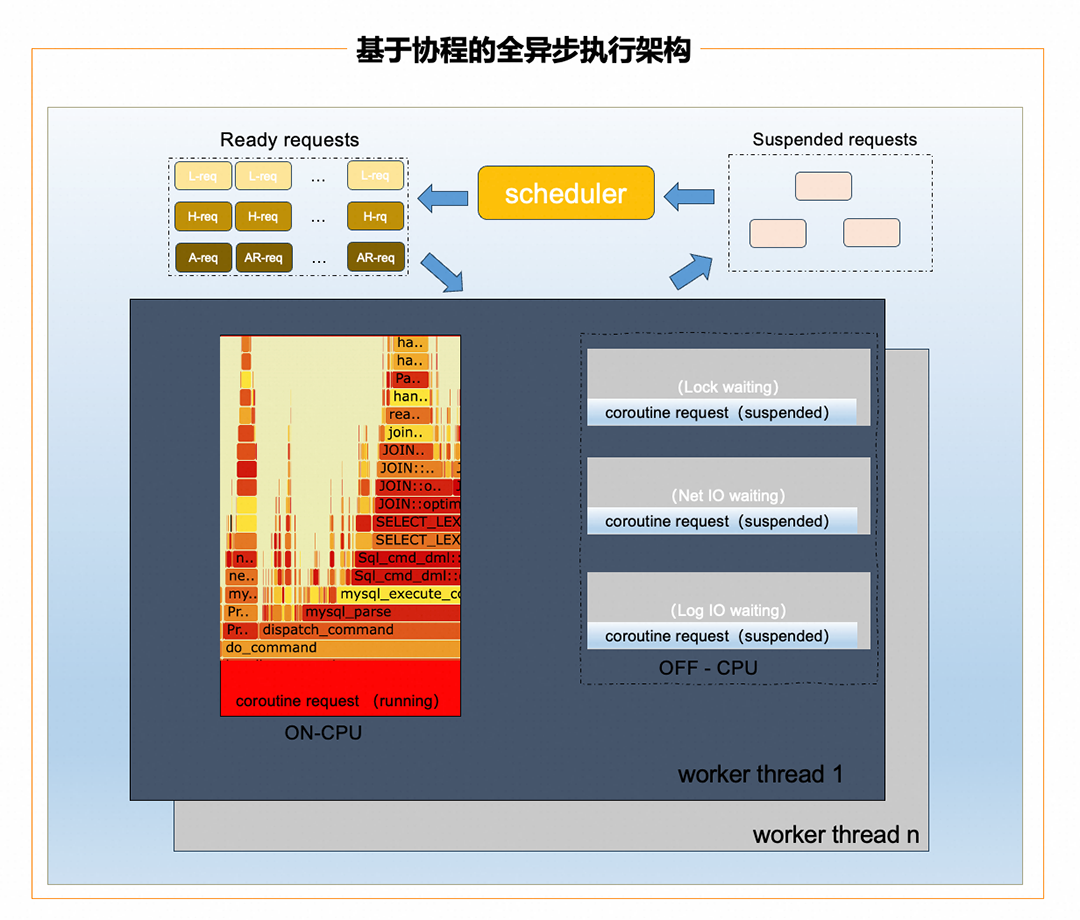 因此,部分其他数据库的异步任务处理机制,只能让客户端异步的执行SQL任务,并非DB内核线程的异步执行,解决不了高并发下的内核性能问题。基于MySQL历史代码的异步化执行改造,涉及连接管理、SQL执行和事务处理等多个核心模块,挑战极大,要求在保持事务完整性的同时,提升系统的吞吐量并减少长尾延迟。PolarDB MySQL异步执行方案的核心是通过协程技术来实现用户请求跟线程之间解耦,利用eventfd来实现协程之间的通信。- 请求协程化:事务请求被封装为独立协程,由用户态调度器管理。