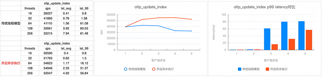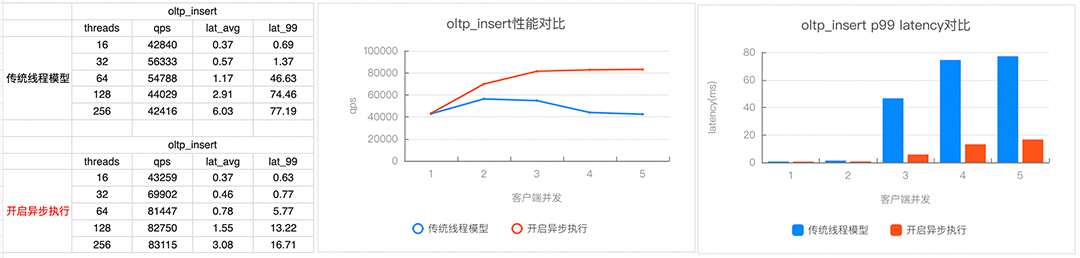 为了解决数据库多线程调度模型下CPU争抢、频繁上下文切换等导致的性能问题,阿里云瑶池旗下的云原生数据库PolarDB MySQL版设计了基于协程的全异步执行架构,实现鉴权、事务提交、锁等待等核心逻辑的异步化执行,这是业界首个真正意义上实现全异步执行架构的MySQL数据库产品,显著提升了PolarDB MySQL的高并发处理能力,其中通用写入性能提升超过70%,长尾延迟降低60%以上。基于异步执行架构,数据库前台线程能够专注于执行代码指令,避免不必要的上下文切换开销。与传统的MySQL线程模型相比,这是一次巨大的进步和彻底的革新。目前PolarDB MySQL全异步执行架构在多个客户场景中落地,未来随着功能的完善以及推广,会将该技术应用到更多的客户场景中。图1:sysbench各写入模型性能对比