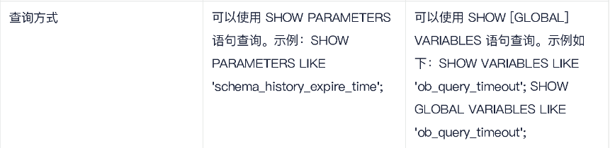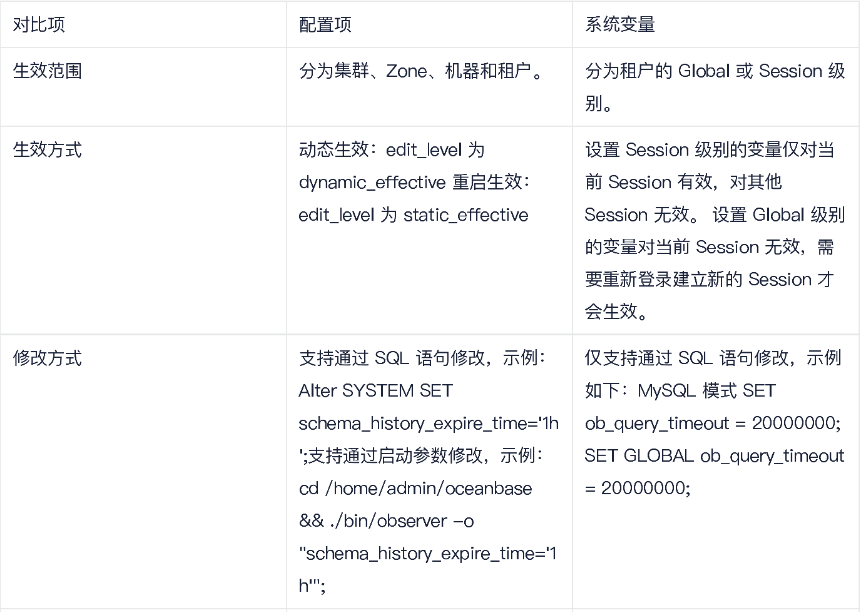 尤其是要注意类似于 TENANT 或者 OBSERVER 这种 tag,估计研发同学在写标签的时候实在不知道相应的配置项该归为哪个模块更合适了,就直接偷懒把标签打成了TENANT 或者 OBSERVER,但这个标签并不代表对当前 tenant 或者当前 session 直连的某个 OBServer 生效。最后附上一个配置项与系统变量的对比: