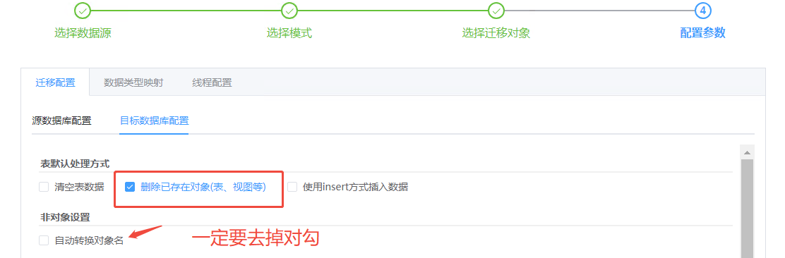 自动转换对象名一定要取消对勾,因为源端和目标端属于同构KES V8,不需要进行对象名转换。