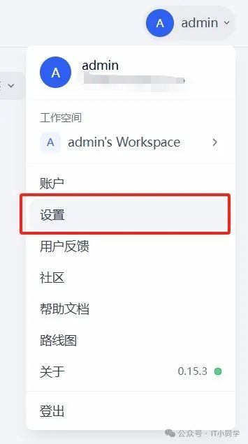 登录进去之后,在 Dify 首页的右上角用户头像位置,选择设置,进入到设置界面,如下图 7 所示: