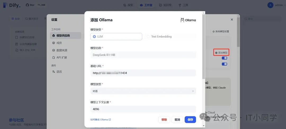 进入到设置界面之后,选择左侧的模型供应商,并且在右侧的添加更多模型提供商列表中,选择 Ollama ,注意选择的是 Ollama 不是 DeepSeek,这里要注意一下。然后点击添加模型按钮,填入必要的信息,如下图 8 所示: