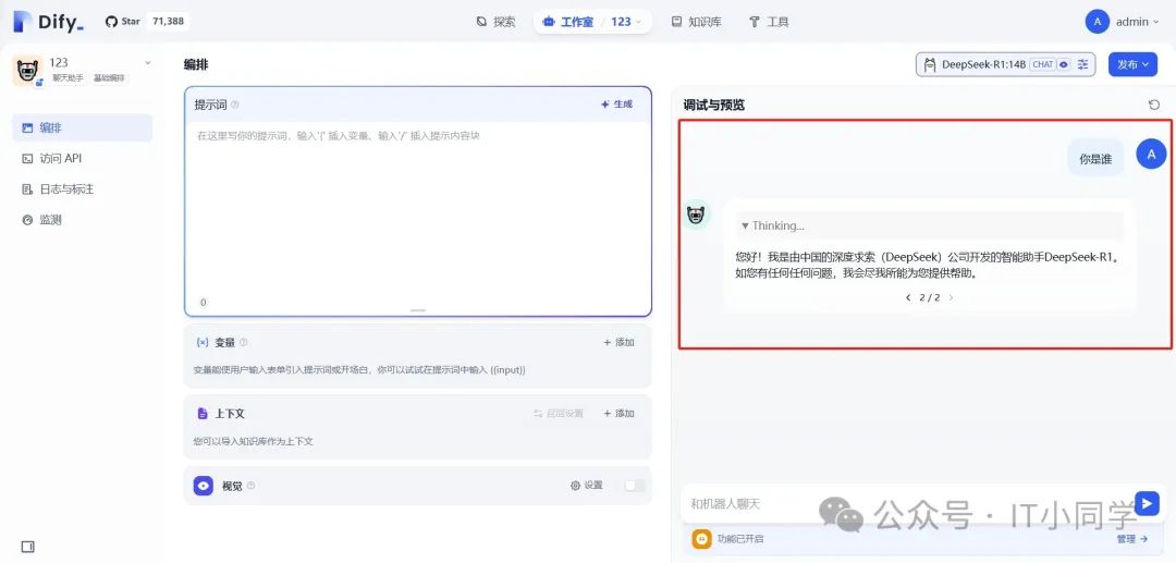 只要 Dify 给了我们回复,就表示我们集成到 Dify 的 DeepSeek 模型是可用的。