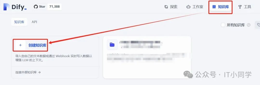 接着,我们来配置我们的知识库,选择 Dify 顶部栏的知识库选项,并点击创建知识库,如下图 13 所示: