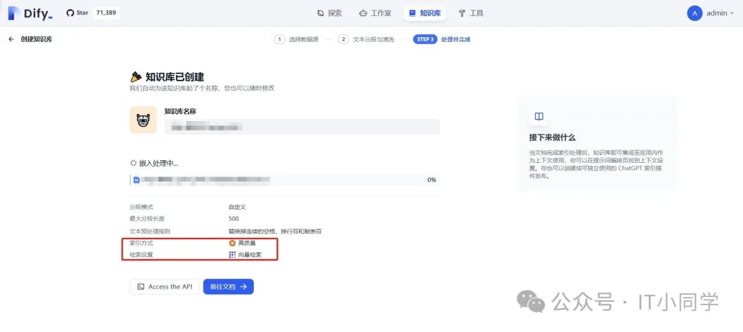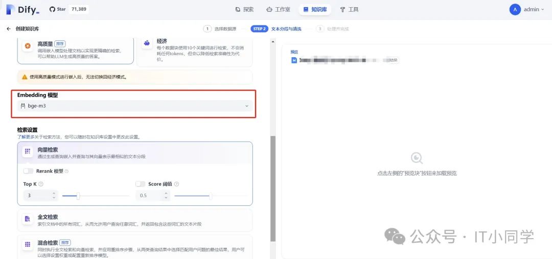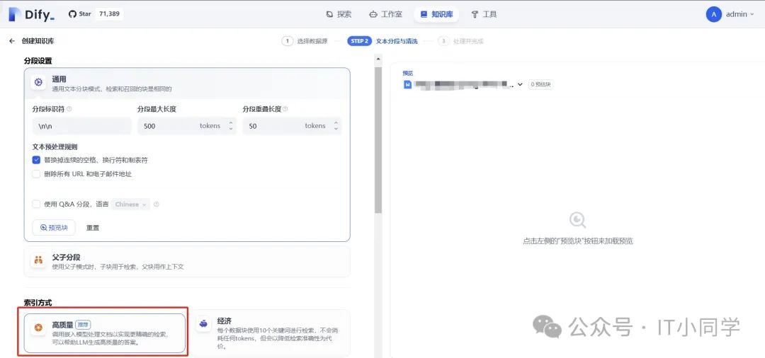 这里面,通用配置不用额外配置,索引方式选择高质量模式,以便更好地对我们上传的文档进行向量化转化。