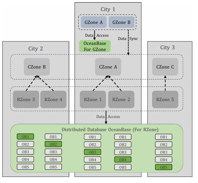 如图 4 所示,OceanBase 中的单元化架构包括区域区域 (RZone)、全局区域 (GZone) 和城市区域 (CZone)。GZone 部署不可拆分的数据和业务活动,而 RZone 部署可拆分的业务和相应数据。GZone 全局部署一次,并由 RZone 依赖。RZone 内的每个数据分片都有五个副本,实现三站点五数据中心的部署,每个分片只有一个可写的主副本,其余副本使用 Paxos 协议保持数据强一致性。每个 RZone 实现单元封装,独立处理所有自身操作。