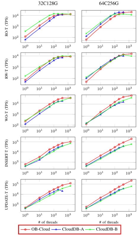 实验表明,在 RO 等读密集型子基准中,当面临高请求压力和大规模 CPU 设置时,OB Cloud 的性能优于其他系统。OB Cloud 之所以能实现更高的吞吐量,是因为各个单元协助处理请求,避免了主节点过载。在 INSERT 和 UPDATE 等写密集型或高竞争子基准中,OB Cloud 在所有实验设置中始终实现最高吞吐量,这是由于: