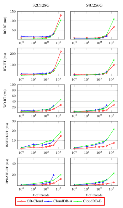 对比不同分布式数据库系统在变更请求频率和 ECS 实例模式下的响应时间发现,在 RO 场景中,OB Cloud 在 64 核配置下的平均响应时间比 CloudDB-A 和 CloudDB-B 低 30% 以上,体现了其在高并发读场景下的低延迟优势。在 RW 混合场景中,随着线程数增加,OB Cloud 的响应时间增长更为平缓,显示出更好的负载均衡能力。
