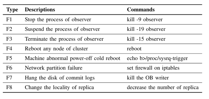 为评估 OceanBase 系统可用性,实验模拟了集群遭遇故障或灾难的场景。故障场景包括 OceanBase 服务器进程停止、节点重启、网络分区等八种常见故障: