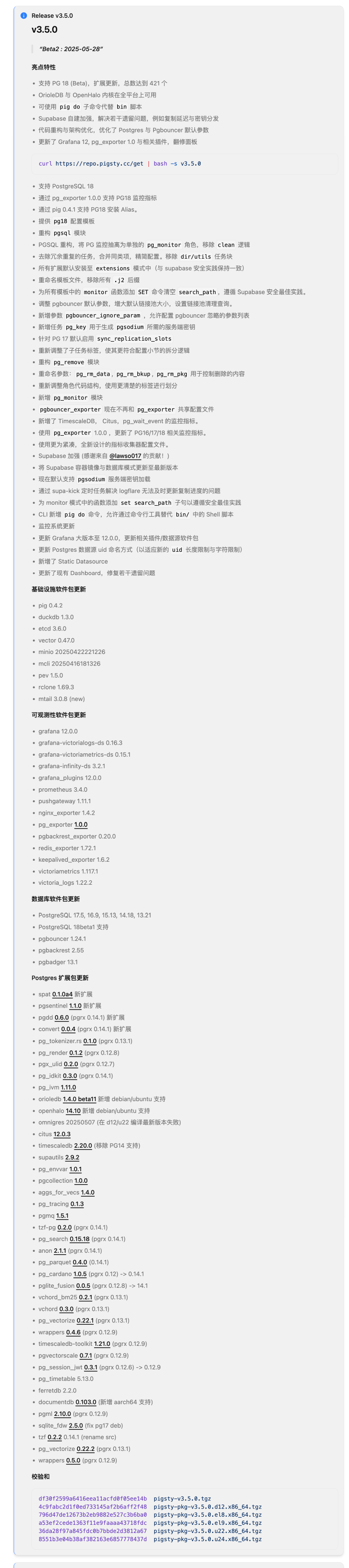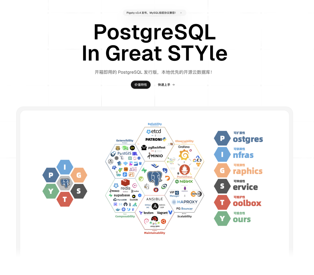 Pigsty v3.5 正式发布,4000+ GitHub Star 达成,全新文档网站,OrioleDB 和 OpenHalo 内核全平台可用,Supabase 自建优化,监控系统与架构优化,PG18 支持,例行 PG 小版本更新,苹果 ARM Vagrant 支持。