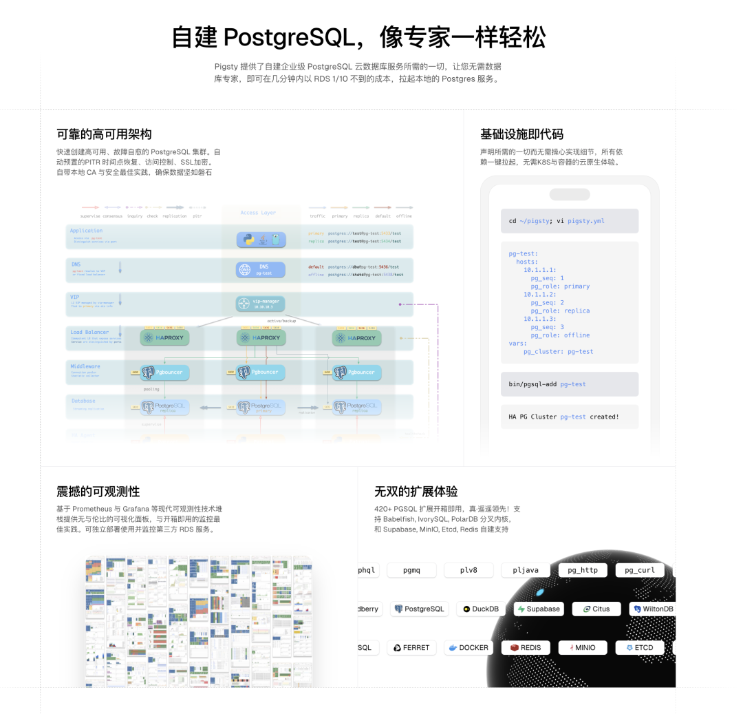 Pigsty 是一个开箱即用的 PostgreSQL 数据库发行版,是数据库的自动驾驶软件,可以让你在本地一键用云 RDS 1/10 不到的成本,在没有专业 DBA 的情况下,拉起企业级 PostgreSQL 数据库服务,带有高可用, PITR,监控系统,IaC,以及 421 个 PG 生态的扩展插件,直接运行在 10 个主流 Linux 发行版上而无需容器或 Kubernetes 支持。