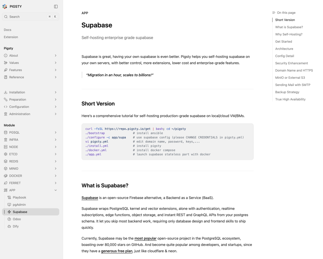 Pigsty 提供 “企业级” Supabase 自建能力,广受用户欢迎。欢迎程度超出我的预期 —— Supabase 自建教程的页面流量甚至比 Landing Page 还要大。所以在这个版本中,进一步优化了 Supabase 自建的流程。