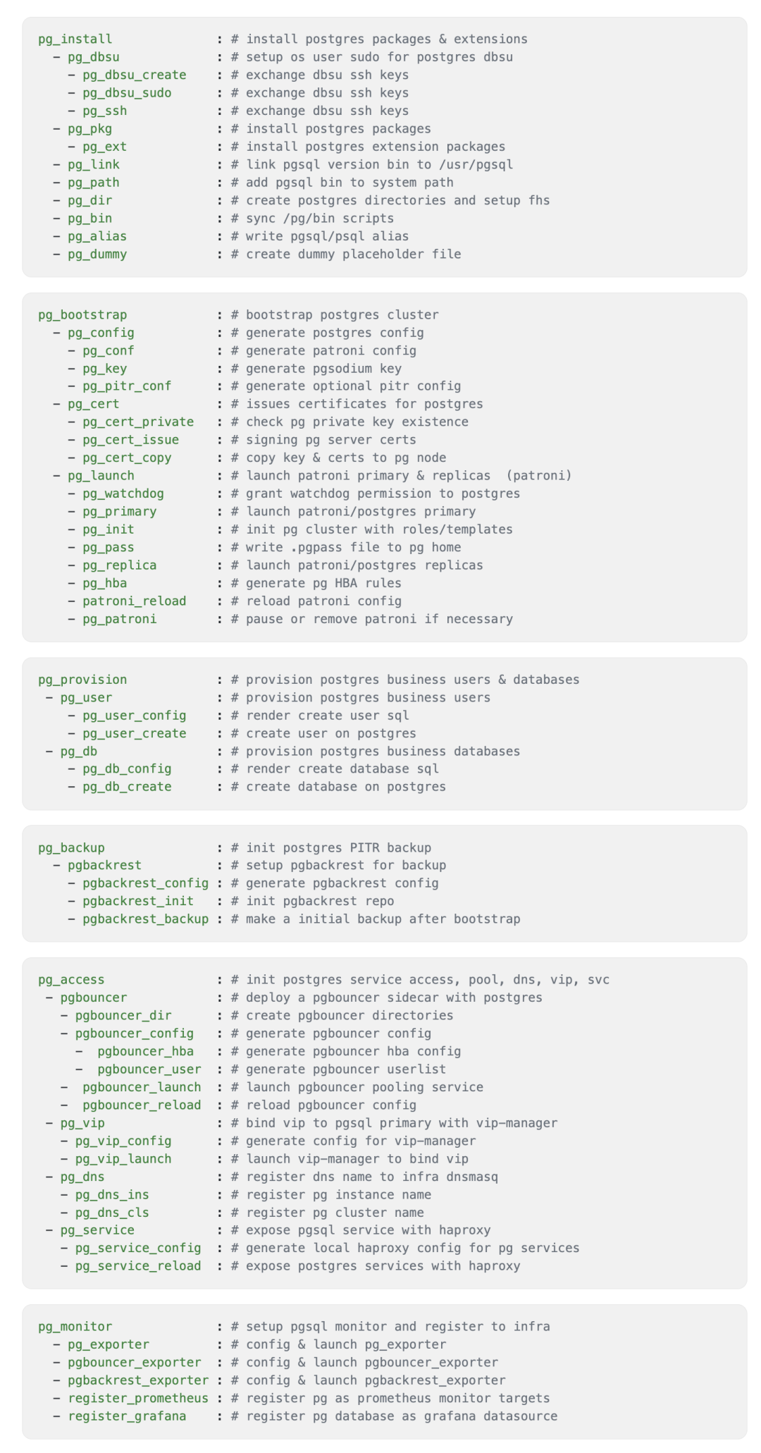 除此之外, Pigsty v3.5 还对 PGSQL 实现进行了优化。合并减少了任务的数量,微调了可用的任务标签,统一了模板文件的名称,优化了现代 NVMe 环境下的系统与数据库参数默认值,并对 roles 分工进行了一些调整。