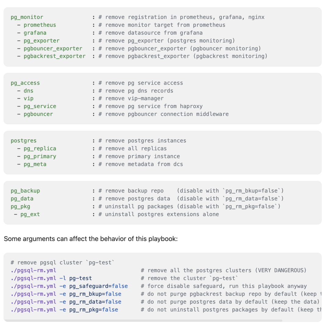 但这些内部实现细节对用户来说关系不大,一个主要的改动是,我们去掉 pgsql.yml 剧本删库的功能 —— 是的,从 v3.5 以后,没有那么多花里胡哨的安全阀,保险栓来避免你用 pgsql.yml 来删库了,要想删库,唯一的选择就是 pgsql-rm.yml 专用剧本。