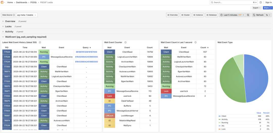 PG 内核本身只提供了当前活动正在等待什么,但是没有过去一段时间的等待事件纪录。只能通过插件实现,pg_wait_sampling 还有上面提到的 pgsentinel 都提供了这个功能,我也在监控面板上提供了对等待事件分析的支持。