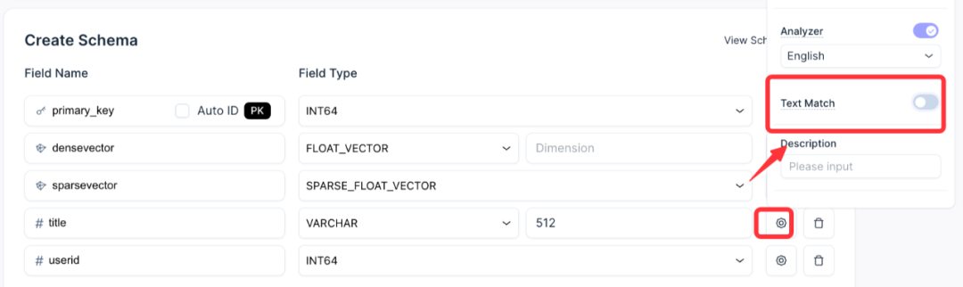列,配置 Function(支持 Standard 或 Custom Analyzer),再选择一个 Sparse Field,即可完成全文检索设置。右侧还提供对应的 SDK 示例代码,帮助用户快速理解并顺畅切换到代码模式。直观的文本匹配功能:用户可以在界面中为指定字段直接启用文本匹配,满足精确匹配词语或短语的需求,提升配置效率与可用性。