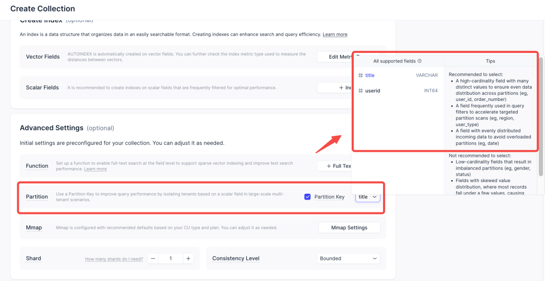 更清晰的解释: 在建表时,我们现在清晰地解释了 Partition key 和 Partition 的区别,引导用户根据实际场景选择合适的租户粒度和 Partition key 字段。