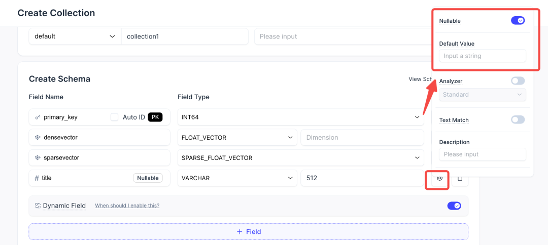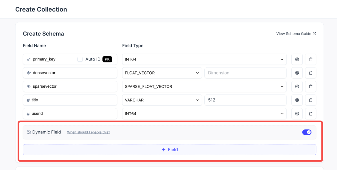 Dynamic filed 对于数据结构不固定、需要频繁新增列的场景非常有用,插入数据时可直接添加新字段而无需更新 Schema。过去界面仅将其视为一个开关,用户不易理解其与其他向量/标量列的关系。本次调整,在 Schema 设计中将其与标量列、向量列并列展示,并辅以描述和使用场景说明,帮助用户理解这也是一种特殊的列类型,并了解其能力差异。