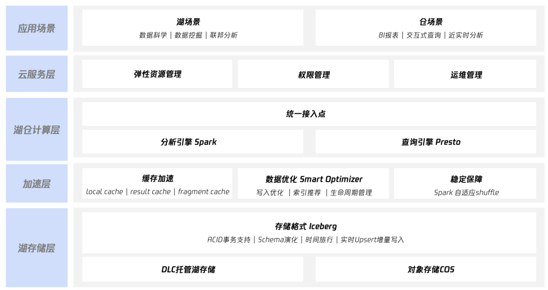 为了解决上述痛点,火花思维选择了腾讯云DLC作为新的大数据处理引擎。腾讯云数据湖计算DLC(Data Lake Compute)是云原生Serverless湖仓分析服务,基于开源引擎Spark、Presto、Iceberg构建并进行了大量内核增强和创新,为火花带来高性能、高可用、低成本的全场景大数据处理服务。