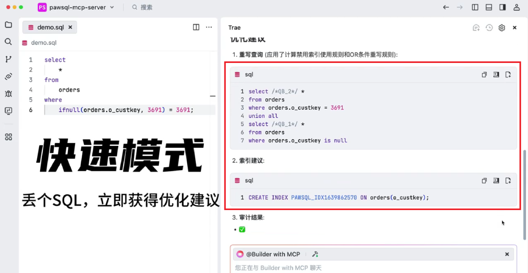 只需要告诉AI助手"优化这个MySQL查询",PawSQL MCP就会进行自动化的优化:
