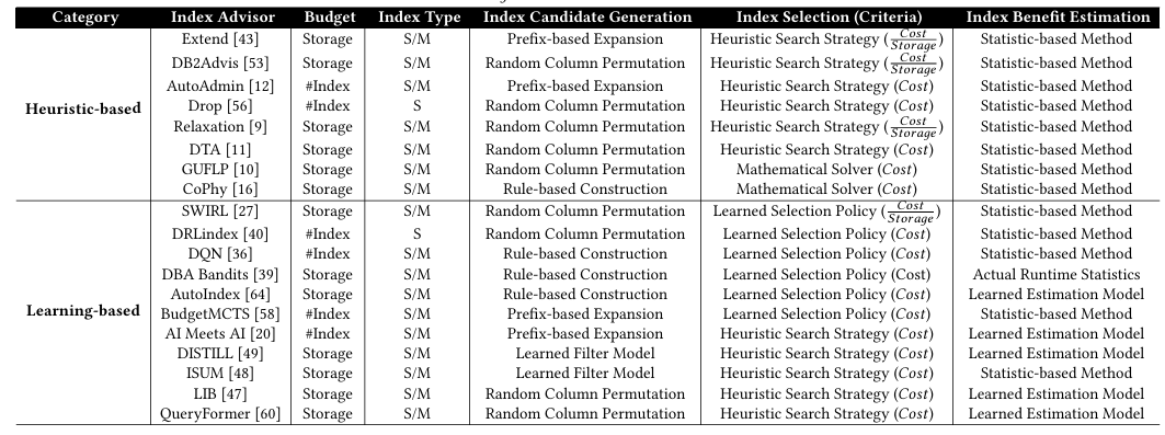 1. 应用场景:上图总结了基于启发式和基于学习的索引推荐的应用场景: