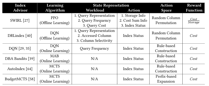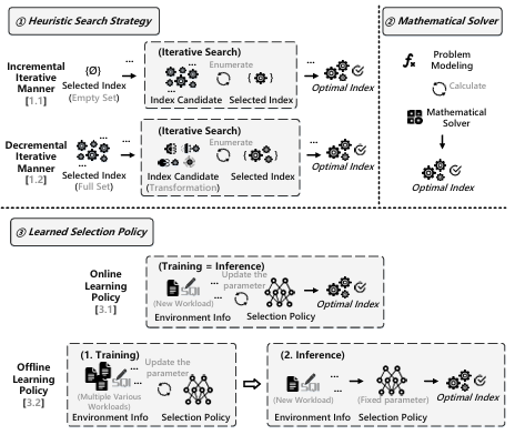3. 学习选择策略:该类型将选择过程转换为马尔可夫决策过程(MDP),并利用强化学习来解决这个问题。具体来说,以状态表示(如工作负载特征信息)作为输入,这些方法通过学习的选择策略遍历预定义的索引候选,并基于奖励函数优化策略。基于这些方法是否能适应动态工作负载,学习的选择策略可分为在线学习策略或离线学习策略。