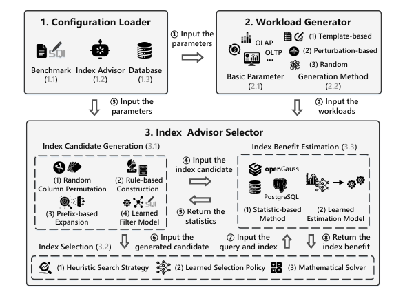2. 统一测试平台:本文开发了一个测试平台,该平台通过统一接口在11个数据集上实现了17个索引推荐。不同于现有研究独立开发了索引推荐,作者开发了一个开源测试平台以实现全面评估的目标: