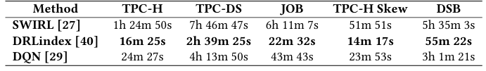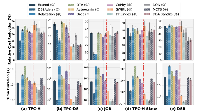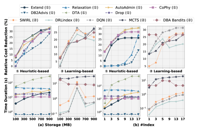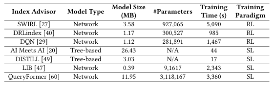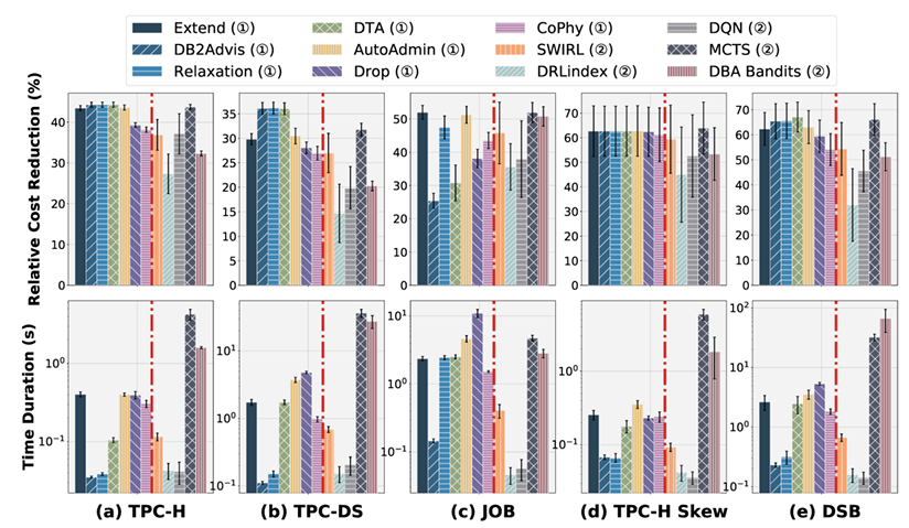 2. 时间duration:不同索引推荐返回索引所需的时间开销。对于采用离线学习策略的基于学习的索引推荐,其训练开销需单独考虑。
