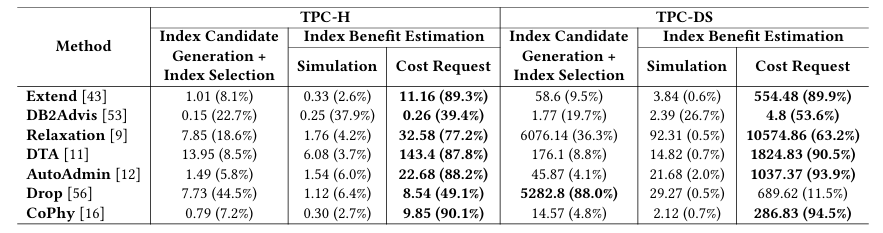 为进一步确定基于启发式索引推荐中最耗时的步骤,实验观察到,索引收益评估所花费的时间占很大比例,因为这涉及使用假设调用来模拟假设索引(即模拟)和推导估算查询成本(即成本请求)以计算索引收益。成本请求是最耗时的步骤,平均占选择时间的72.73%。