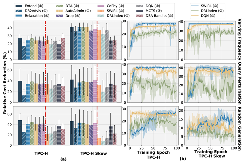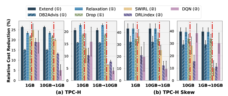 O5(频率变化与查询扰动):基于启发式和基于学习的索引推荐在频率变化和小扰动的工作负载上具有鲁棒性。如图(a)中,在TPC-H基准上,基于学习和基于启发式的索引推荐在频率变化和查询扰动的工作负载上实现了相似的相对成本降低,平均分别为28.53%和27.29%。然而,在具有偏斜数据分布的TPC-H Skew基准上,性能明显更差,平均分别为38.58%和30.31%。图(b)绘制了具有离线学习策略的基于学习索引推荐的训练曲线,在TPC-H Skew基准上的查询扰动工作负载中,其训练曲线的振荡程度高于TPC-H基准上的频率变化工作负载。所有这些结果表明,基于学习的索引推荐有能力处理简单数据分布上的轻微变化动态工作负载,因为它们可以通过几次试错尝试捕捉基本查询模式并识别有效索引。