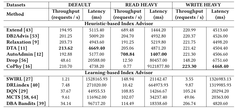● 此外,现有工作要么在静态场景(即固定工作负载)中只评估基于启发式的索引推荐,而没有评估基于学习的索引推荐,要么仅研究索引推荐的鲁棒性。
