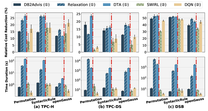 工作负载下的性能(①代表基于启发式的索引推荐,②代表基于学习的索引推荐)