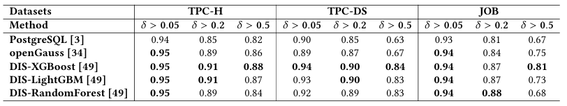 O11(学习过滤模型):基于树的过滤模型可有效过滤无用索引候选,其中改进是最关键的输入特征。实验表明,树基过滤模型的F1分数高于基于数据库优化器估算统计信息的方法。在不同过滤阈值s下,DIS-XGBoost的F1分数平均为0.89,而PostgreSQL为0.82。为进一步确定对这些模型的有效性贡献最大的输入特征,实验观察到改进是最关键的特征,这与索引的功能一致,即优化查询计划中节点的操作。因此,模型可以估算索引的影响并过滤掉影响低的候选。