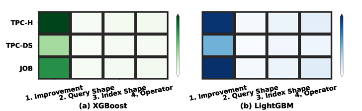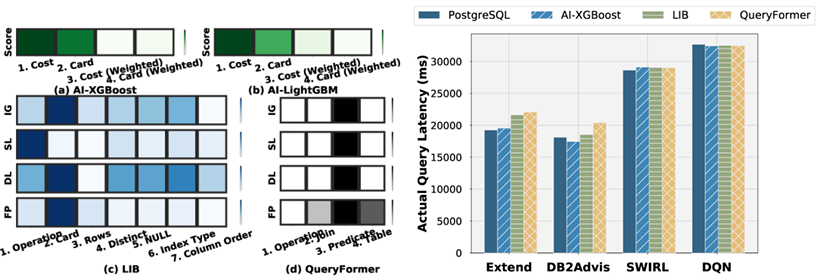 然而,其他模型需要更多的训练工作(即更高的训练难度)才能有效学习输入特征之间的相关性。上图显示了输入特征的重要性分布,其中每行对应于由可解释机器学习算法计算的重要性分数。实验观察到估算基数(Card)、估算成本(Cost)和谓词信息(Predicate)是这些学习模型的关键输入特征,这与索引的功能一致。